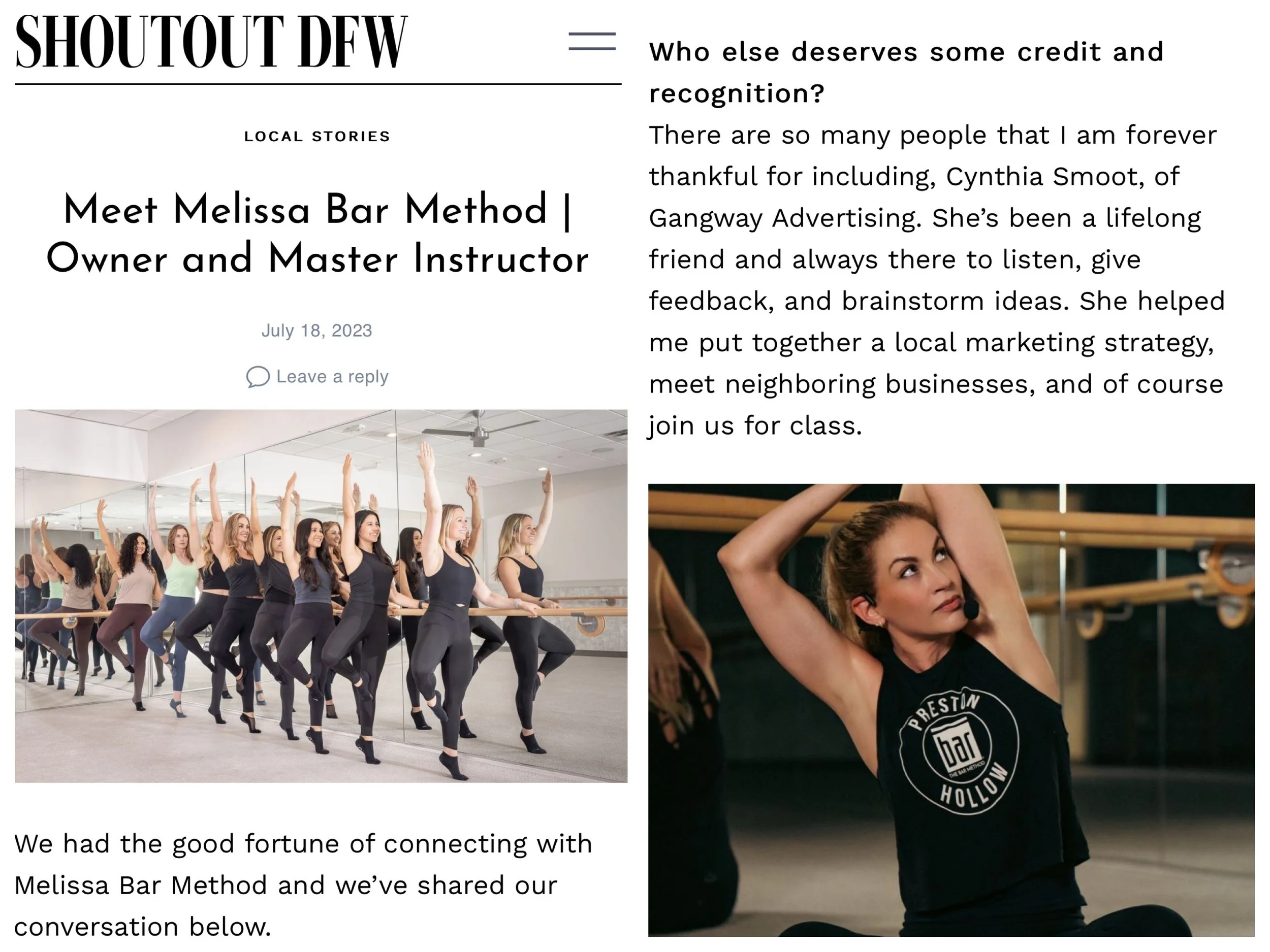 Shoutout DFW interviewed Bar Method Owner and Master Instructor, Melissa Moore and they asked her, “Who else deserves some credit and recognition (for your success)?